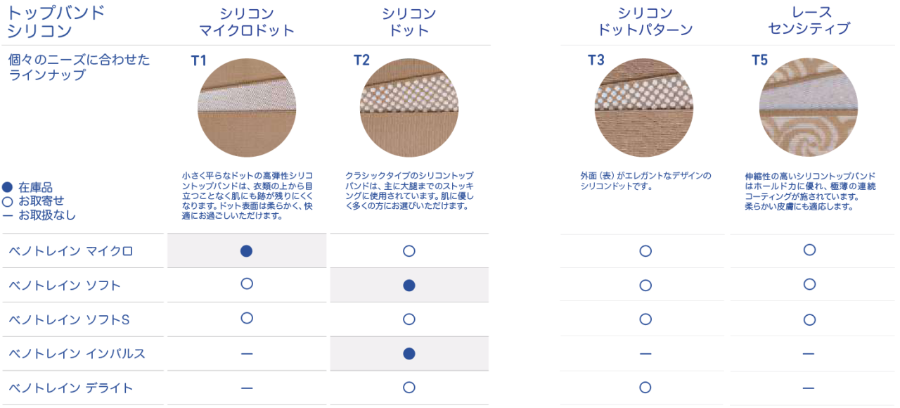 トップバンドによりストッキングをしっかりとフィットしすべりにくくなります。やわらかい素材は通気性に優れ、肌にやさしく着心地も快適です。各デザインをご確認ください。